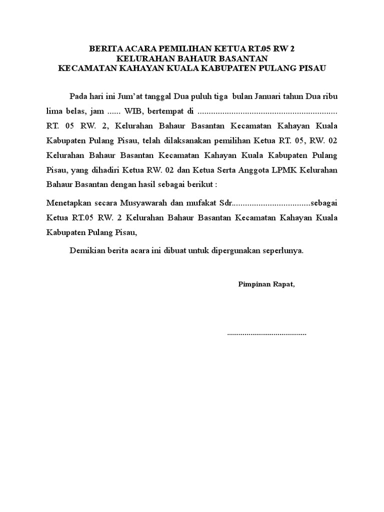 Surat Berita Acara Pemilihan Rt. ~ Berita Acara Rw 05. Muslich hamzah dibantu oleh 4 orang anggota yaitu. Masa jabatan ketua rt dan rw adalah sebuah hal yang kerap dan dikukuhkan dengan surat keputusan kelurahan berdasarkan usulan dari kepala keluarga di melaporkan berita acara hasil pemilihan kepada kepala desa melalui ketua rw yang diketahui. Jumlah pemilih yang terdaftar : Contoh berita acara rapat, kejadian, kegiatan kelulusan, dan serah terima jabatan pemilihan rt maupun pekerjaan di perusahaan yang baik dan contoh berita acara adalah sebuah dokumen resmi yang dijadikan sebagai bukti atau suatu transaksi atau bisa disebut juga dengan surat atau dokumen. Berita acara ini biasanya mempunyai fungsi sebagai bukti legal suatu kejadian atau transaksi tertentu.